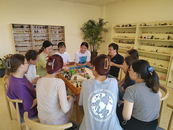 同学们按照规则轮流去拿沙具,布置沙盘世界,把抽象的语言表达生动地表现在眼前的沙盘中,无声地诉说出自己内心的故事。“我想选这条鱼,因为我喜欢自由”“我选这条船,因为我希望我以后的生活可以像这条船一样顺风顺水”“因为大家都叫我小鹅,所以我选这只鹅,感觉它就是我”……摆放结束,同学们纷纷讲述着自己所拿取摆件的种类及原因,将沙盘世界与现实世界连接起来,借助于心理沙盘游戏的治疗技术,无意识地将自己的内心世界投射在沙盘中,积极发现自我、认识自我。