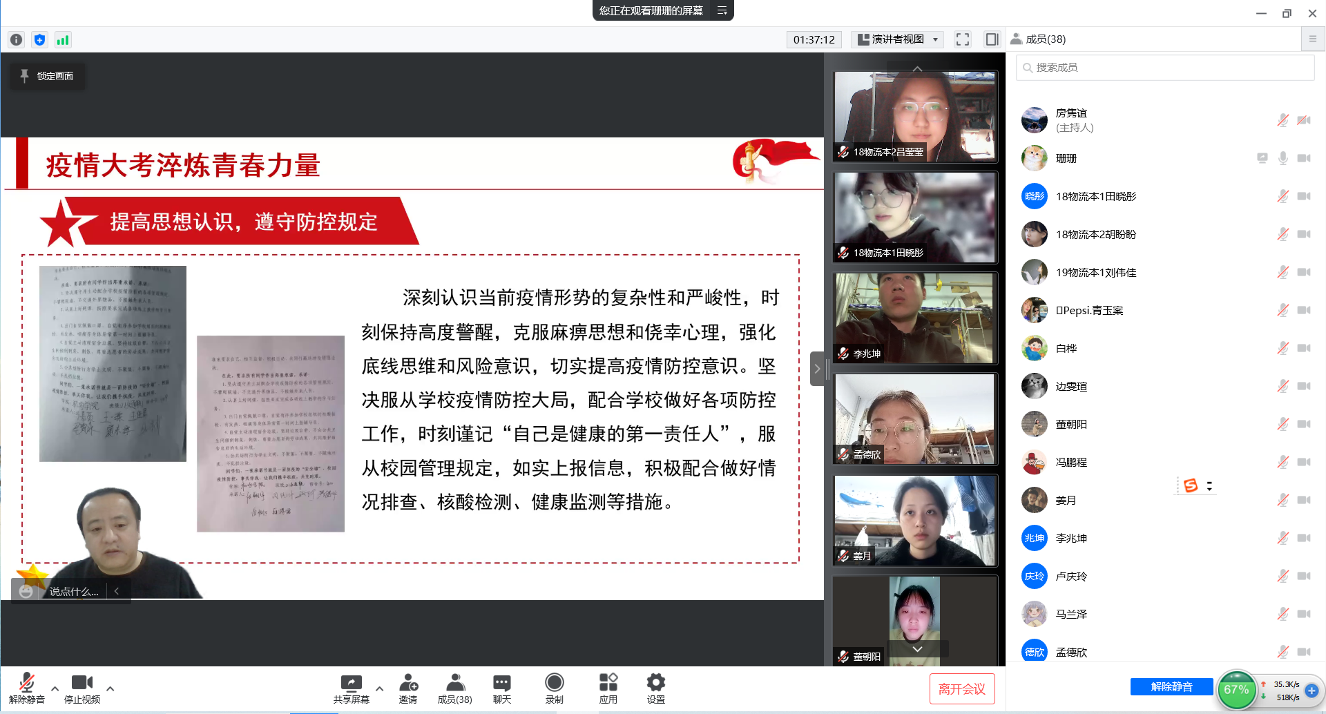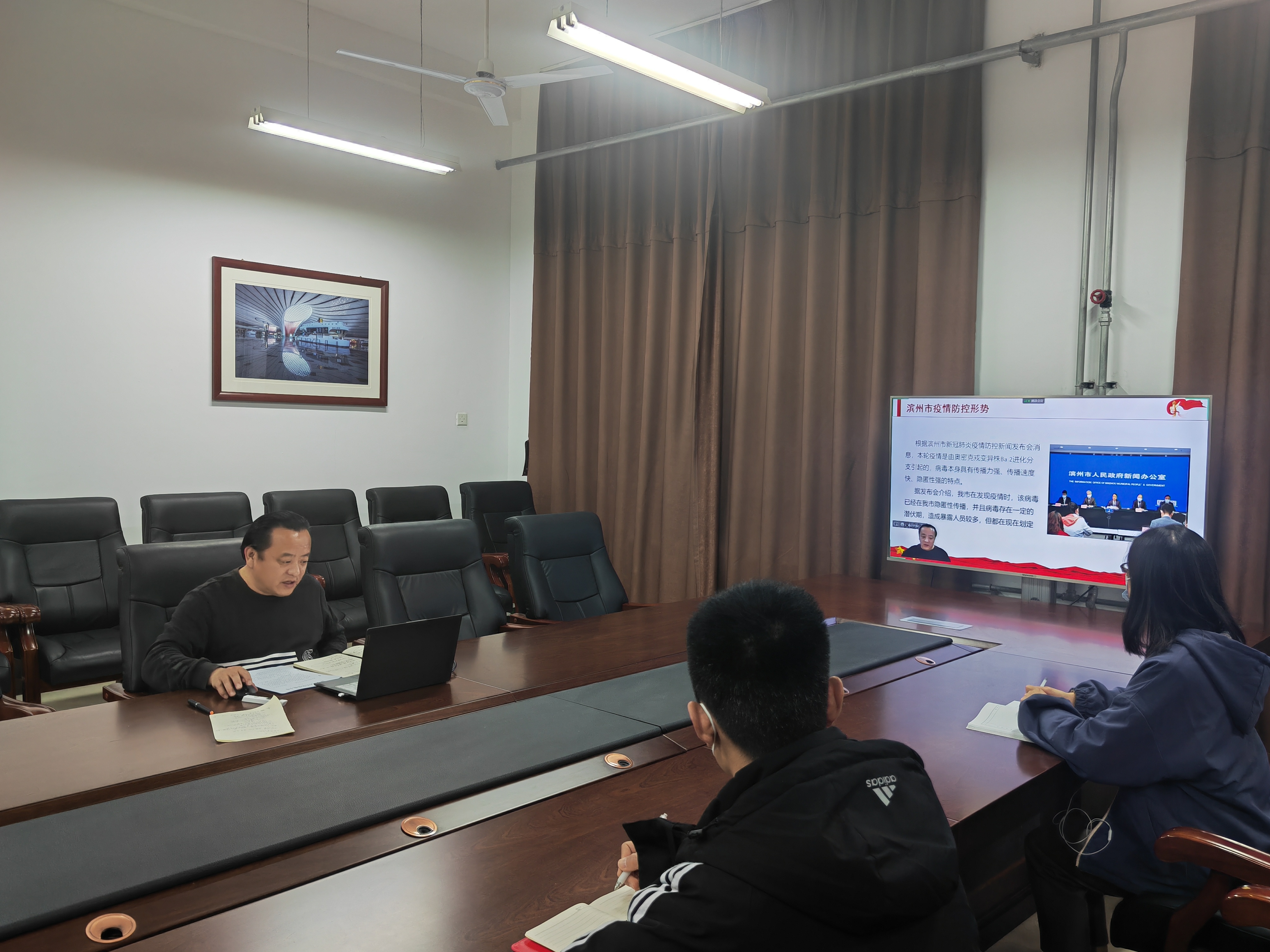 张健书记从“当前疫情防控形势”“滨州学院:抗疫路上 你我同行”“疫情大考淬炼青春力量”等三个方面展开,介绍了当前滨州市疫情防控形势和学校为积极应对疫情所采取的各项防控措施,肯定了同学们在思想引领、志愿服务、遵规守纪等方面发挥的模范带头和榜样示范作用,并就如何在疫情大考中淬炼青春力量给全体学生提出三点要求。一是提高思想认识,遵守防控规定;二是加强自我防护,做好安全保障;三是强化责任担当,彰显青春力量。