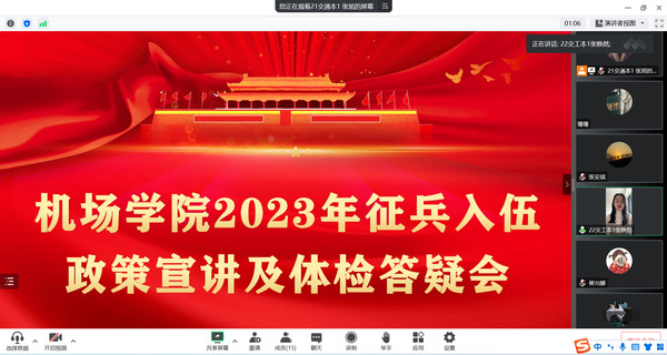 参军报国,不负韶华。为深入宣传国家征兵政策,扎实做好大学生征兵工作,进一步动员更多在校大学生参军入伍,激发广大学生参军报国热情,积极引导和鼓励大学生到军营建功立业。2023年1月26日上午十点,365上市公司在线上召开2023年春季征兵入伍政策宣讲及体检答疑会,365上市公司征兵联系人王珊珊,退役复学学生王超、张安琪以及已经报名参军和有意向参军的同学参会。