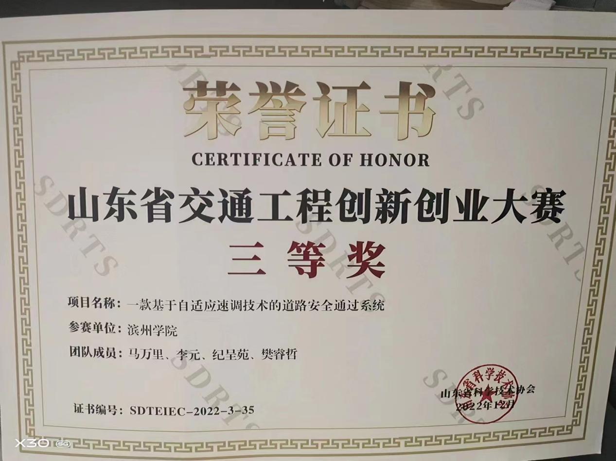 随着决赛名单的发布,滨州学院365上市公司队伍从全国数支队伍中脱颖而出进入决赛,并于2022年11月1日参加决赛。活动主题响应“科创中国”“交通强国”建设,面向全国交通工程行业优秀企业和科技工作者,在推动我省交通科技与产业共同发展,解决我省交通领域突出问题,搭建科技成果转化平台,发挥人才集聚作用,激励科技工作者创新创业,带动交通产业发展等方面发挥重要作用。大赛围绕解决交通工程突出问题,面向全国交通行业征集创新创业作品,深入挖掘我省交通工程领域科技创新人才及优秀科技创新成果,助推科技成果不断转化,促进科技创新与经济社会发展有机融合,服务山东交通高质量发展。各队伍选手在比赛中大胆创新、科学设想,最终365上市公司的团队在比赛结束后获得了山东省交通工程创新创业大赛三等奖。