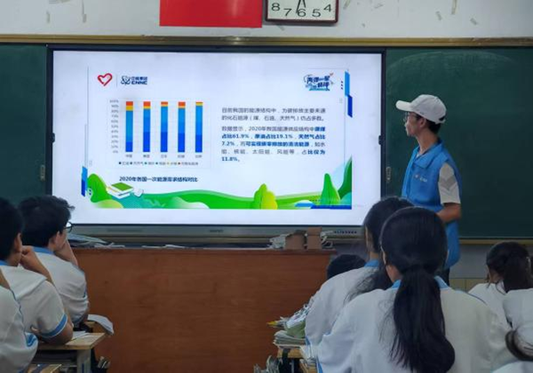 同时,宣讲人丁一赫创新性地将“两弹一星” 精神与当下的 “碳达峰、碳中和” 目标联系起来。他介绍,核能作为一种高效、低碳的能源,在实现碳达峰、碳中和的征程中具有重要作用,正如当年科研人员攻克 “两弹一星” 难题一样,如今在新能源领域的探索同样需要不畏艰难、勇于登攀的精神。同学们被这种跨时代的精神传承深深吸引,积极提问互动,现场气氛热烈。