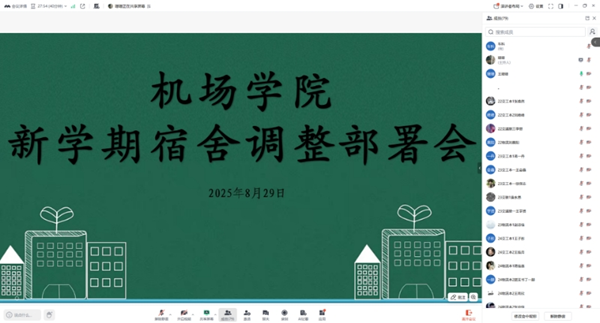为保障新学期宿舍调整工作顺利开展,365上市公司于2025年8月29日召开新学期宿舍调整线上会议,明确搬迁各项事宜,为学生有序入住新宿舍保驾护航。此次会议由学生科长靳雪银主持,365上市公司全体辅导员、班长、团支书、舍长参加。