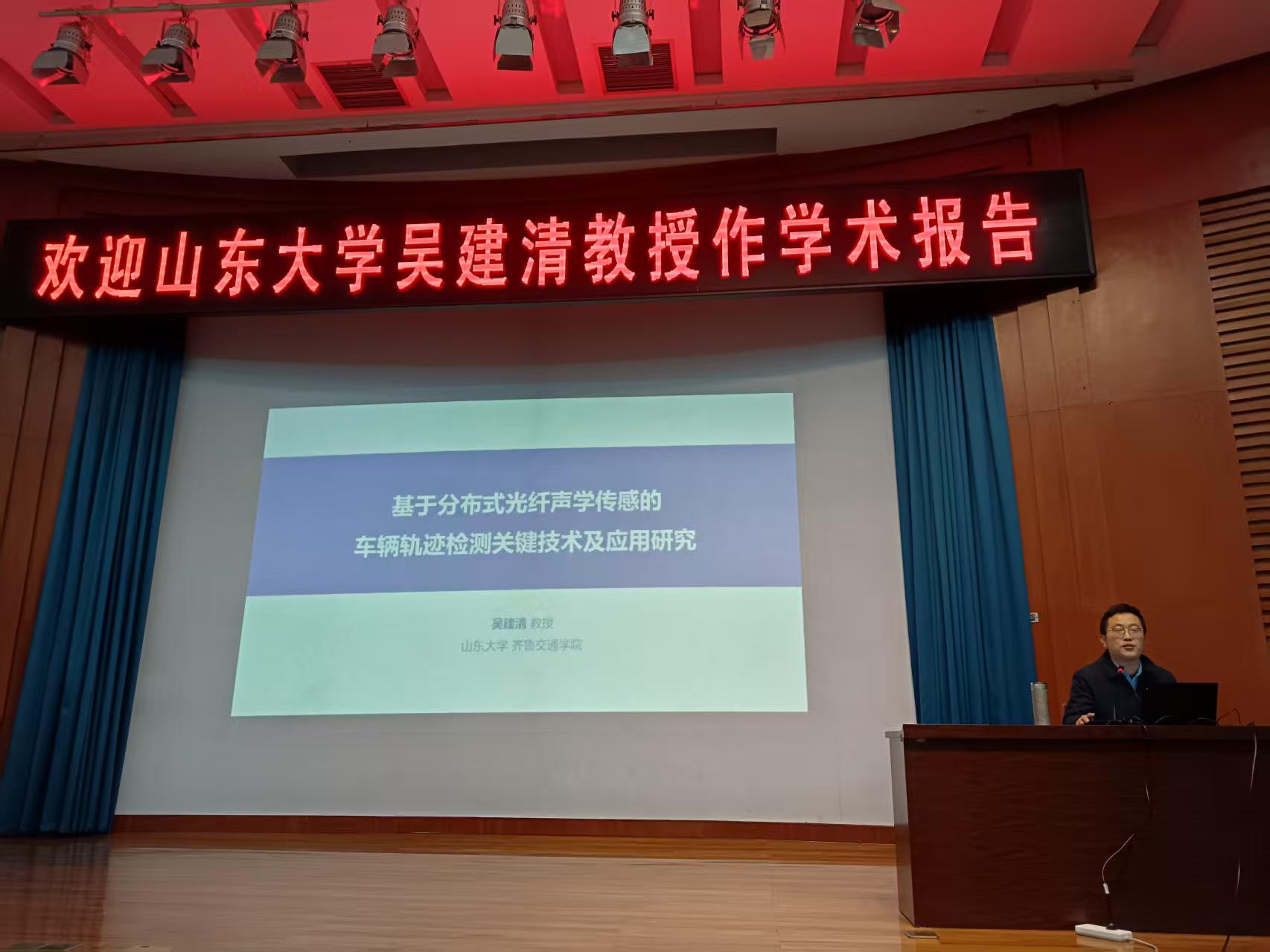 10月20日上午,山东大学齐鲁交通学院吴建清教授应邀来我院作学术报告,报告题目为《基于分布式光纤声学传感的车辆轨迹检测关键技术及应用研究》,报告会由科研秘书王荣娟老师主持,学院科研骨干教师、研究生和本科生参加了报告会。